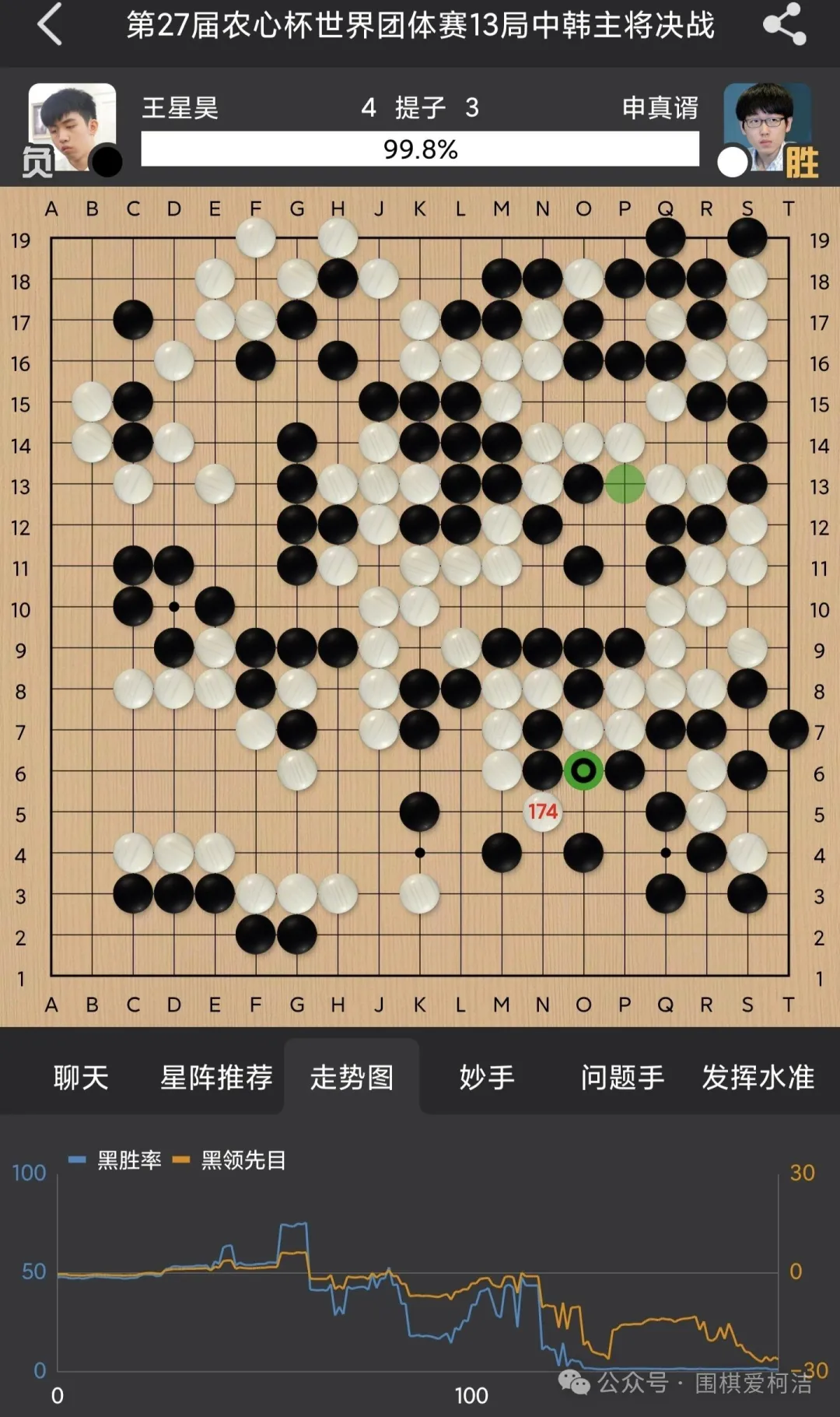 随着棋局推进,王星昊试图通过强攻白棋大龙寻求翻盘机会,可自身棋形的薄弱让进攻难以为继,反而陷入被动防守的泥潭。最终,在174手时,王星昊无力回天,中盘认负。申真谞凭借这场胜利,将个人农心杯连胜纪录刷新至20场,韩国队也顺利挺进最终决战,将与日本队主将一力辽争夺本届赛事冠军。