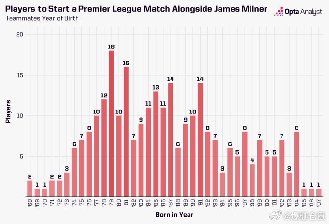 据Opta统计,英超历史上有49%的球员与米尔纳同场竞技过,以队友或对手的身份。另外,米尔纳在英超与281位不同的队友并肩作战,这些队友出生的年份跨度从1968年至2007年。