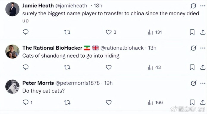 正因如此,祖马加盟山东泰山的消息引起了欧洲球迷的兴趣,但也多是以嘲讽和奚落为主。在祖马可能前往中国踢球的消息下方,有法国球迷评论称:“一个虐猫的人去中国踢球并不奇怪。”还有英国球迷表示:“山东的猫们现在要注意安全了。”“真巧,祖马现在能尝尝猫肉了。”