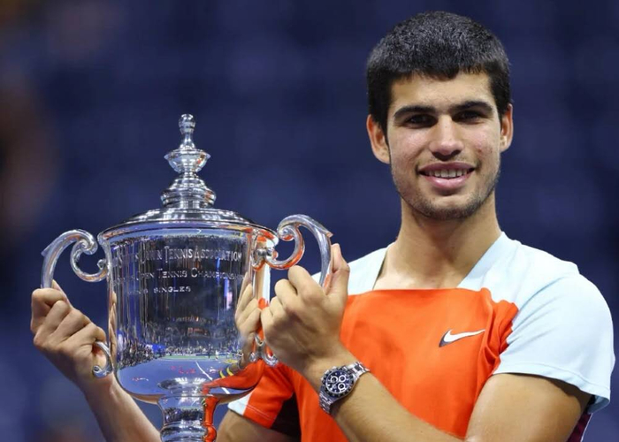 第二次美网夺冠并且登上世界排名第一。2025年美网决赛,阿尔卡拉斯四盘击败卫冕冠军辛纳,职业生涯第二次夺取美网冠军,并且登上世界排名第一。阿尔卡拉斯还以22岁3个月的年纪,成为公开赛年代夺取六个大满贯冠军第二年轻的选手,仅次于21岁1个月的博格。