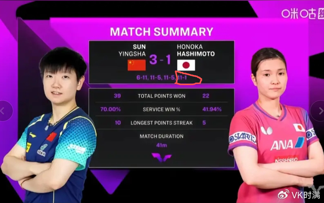 但是,在日本横滨冠军赛过后,桥本帆乃香的此光鲜亮丽战绩,被我们世界第一孙颖莎给顽强终结了!