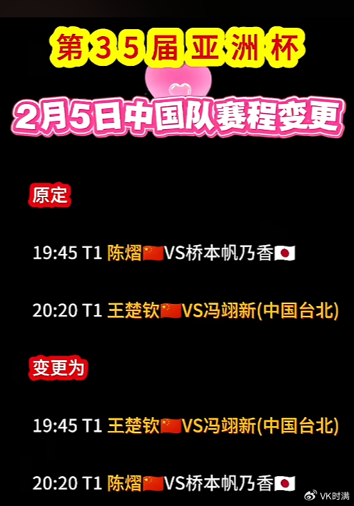可是,2026年亚洲杯第二轮激战中,我们国乒的新秀陈熠,她在遇到桥本帆乃香的赛前,国乒主席王励勤特意把她的对战时间,从晚间19点45分推迟到20点20分出战,跟王楚钦VS中国台北冯翊新调换过来。