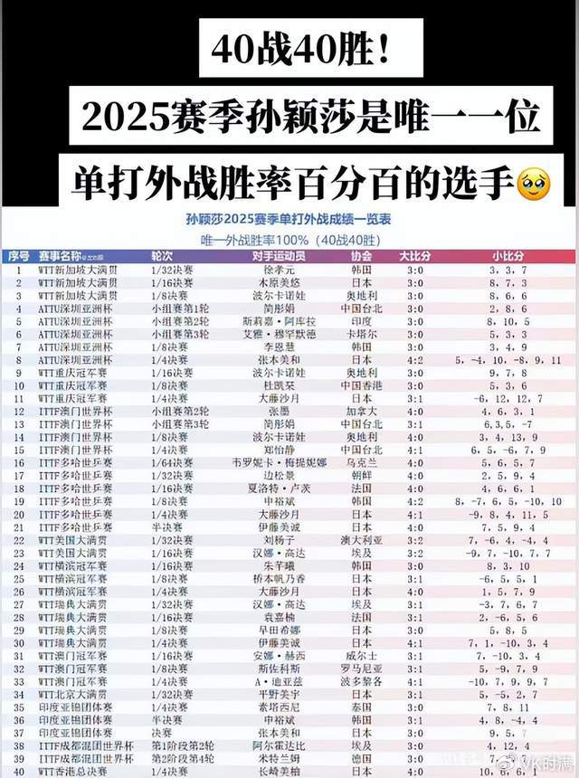 或许你是杠精,或许你是黑粉,或许你是一个不看球的路人,但你必须看下面这四个铁打的详情数据,因为孙颖莎会用顽强的实力击碎所有质疑声。不信的话,请你往下仔细看,立刻就能恍然大悟。