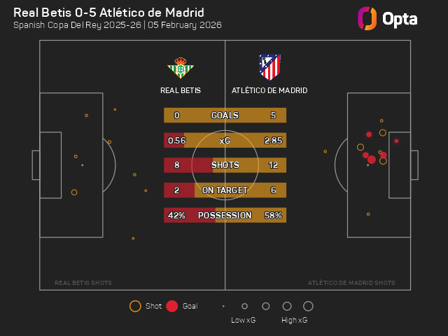 根据OptaJose的统计,马德里竞技取得了他们在国王杯客场对阵西甲球队的最大比分胜利,而皇家贝蒂斯则遭遇了他们在国王杯主场的第二大比分失利,第一大是在1959年0-6输给巴塞罗那。