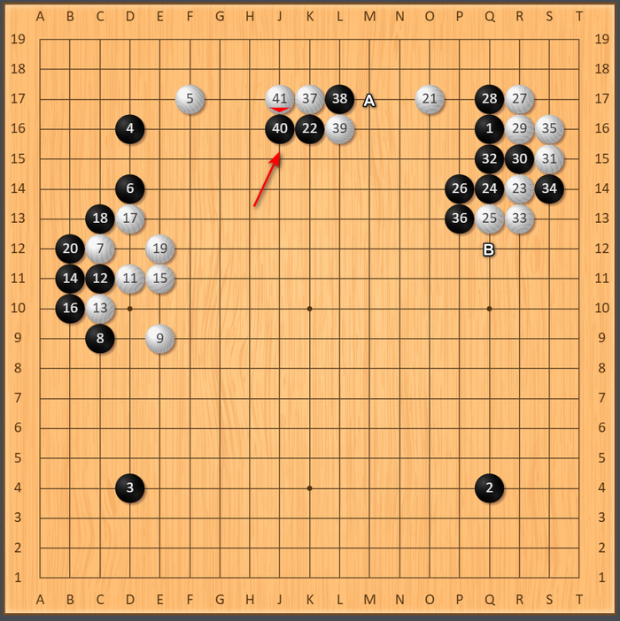 两条复盘意见都不理想,第三条算是对了--黑40不妥。我认为这个扭十字应该长在A位,37、39两子必得其一。