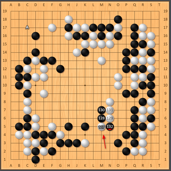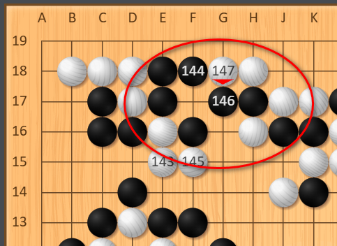 如上图,白127打入,试图破空。我顽强抵抗,白棋小亏。