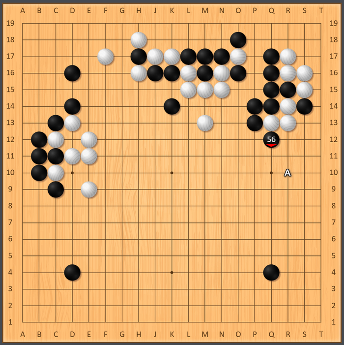 好吧,来点叫人愉快的好棋--56扳头,见上图。这一步,受到王老的赞许,AI同样给出好评!