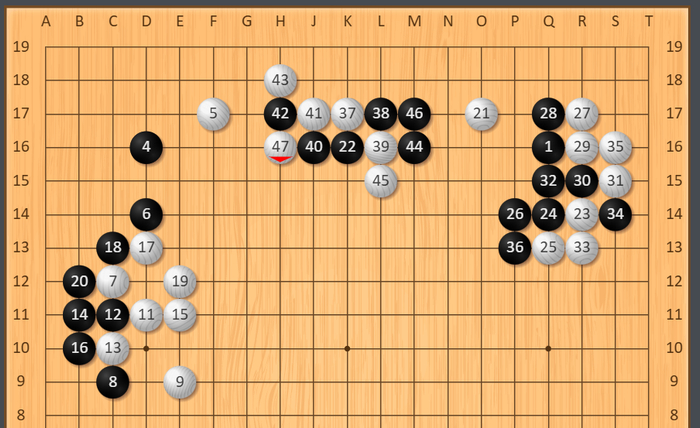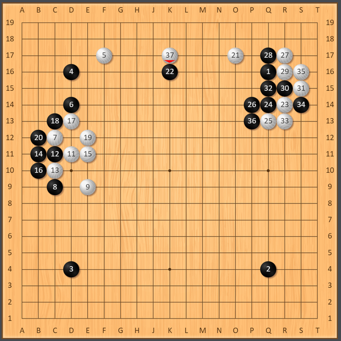实战如上图,我中规中矩地走完“定式”,被王老机敏地抢到37位托!苦心经营的右侧厚势,被消解大半。
