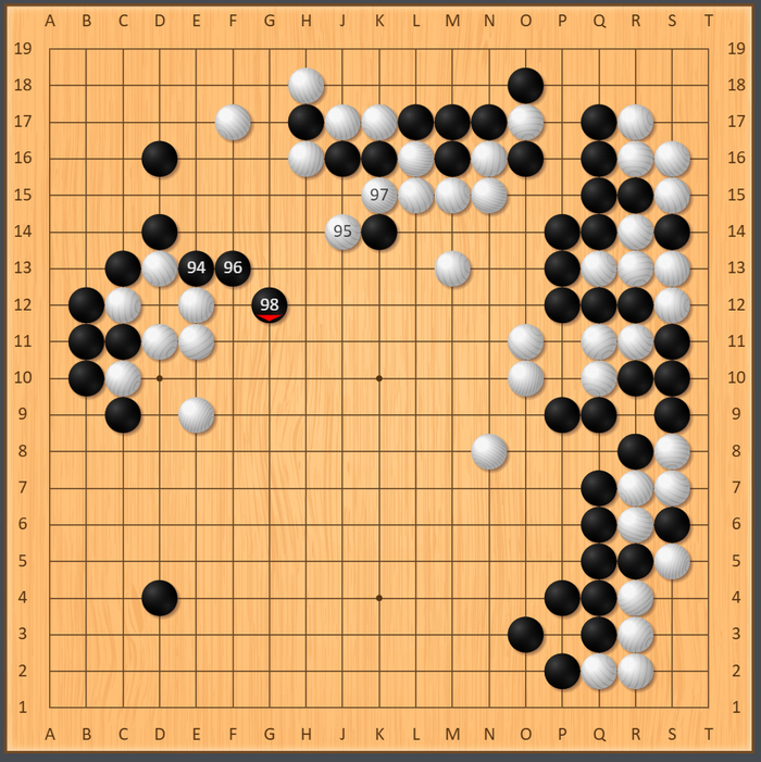 之后,双方并无重大恶手,来到上图。94、96、98三手受到王老表扬--“不但破了白中腹空,还瞄着左边一块白子”。