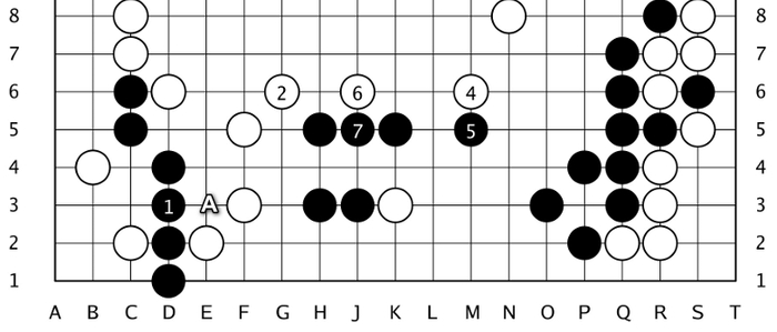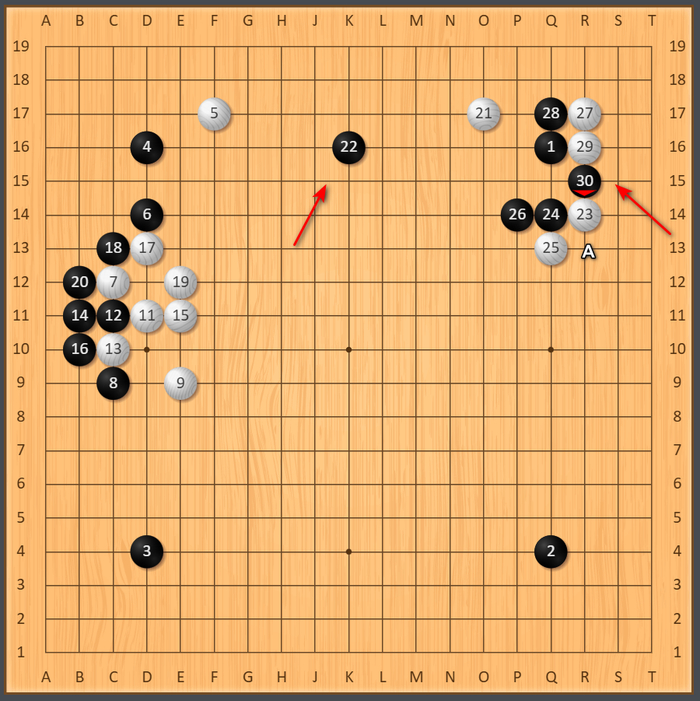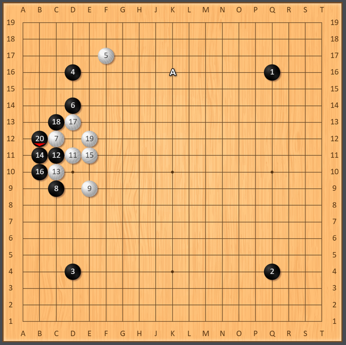 走着走着,到了20步,白吃掉一子,棋形渐满,我不满意。我认为原因在黑10(图中被吃那步棋)不好,应该在A位夹。