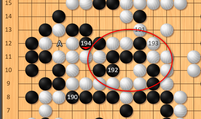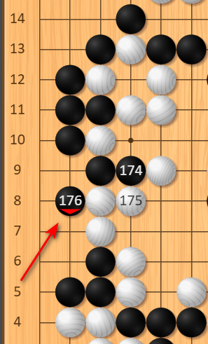 接着,见上图,我又在左边走出了176,这步被AI认为“超神”的一步棋,一举两得的好手。胜率提高到72%!
