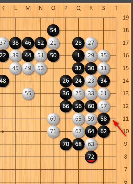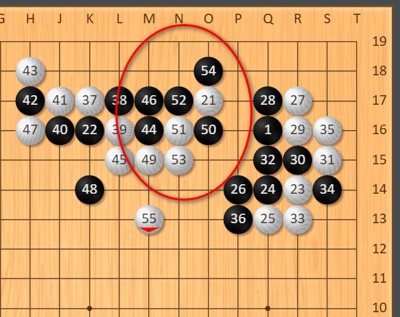 从51到54,黑棋净活。作为职业高手的他,认为51走错了,应该保留,直接走55位跳。以后如果黑棋被封,白棋有54位下立的手段。