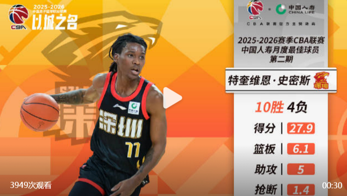 赢麻!CBA官宣:深圳核心贺希宁+史密斯 包揽月最佳球员+外援