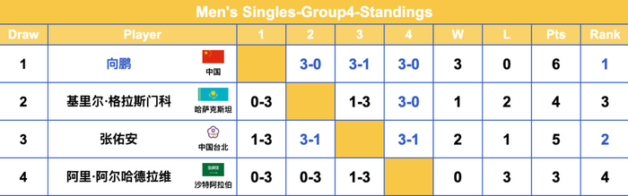 G4组,向鹏以三连胜锁定小组第一,两场3-0与3-1;小组第二的张佑安2胜1负晋级16强。