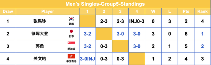 G5组,篠塚大登以三连胜锁定小组第一,两场3-0与一场3-2;郭勇以两胜一负锁定小组第二晋级。韩乒一哥张禹珍吞下三连败小组垫底。