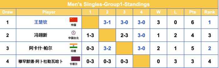 G1组,王楚钦以三连胜小组第一的身份晋级,两场3-0与一场3-1;帕尔以两胜一负锁定小组第二晋级。