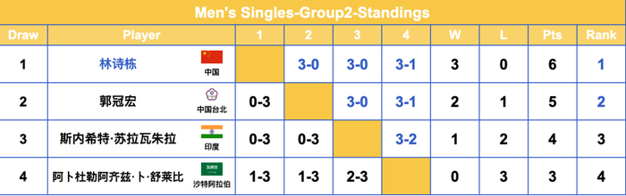 G2组,林诗栋以三连胜小组第一的身份晋级16强,两场3-0与一场3-1;小组第二是郭冠宏,他以两胜一负晋级16强。