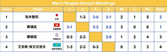 G3组,黄镇廷拿到三连胜以小组第一的身份晋级16强,没想到34岁的大圣可以接连击败张本智和、廖振珽两人,他拿到两场3-2与一场3-1;而日乒一哥22岁的张本智和则以小组第二的身份晋级16强。