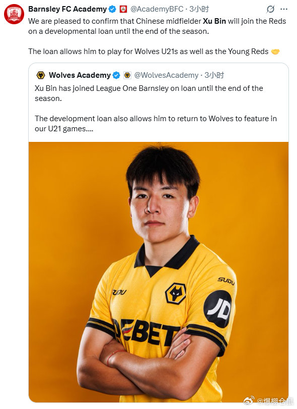 中国后卫徐彬租借至英甲巴恩斯利,可兼战狼队U21 爆棚仓鼠 02.0621:45 关注 【官方】不久前加盟英超狼队的中国籍后卫徐彬租借至英甲的巴恩斯利,同时他还能代表狼队U21参加比赛,巴恩斯利目前排名英甲第14位。#英超#