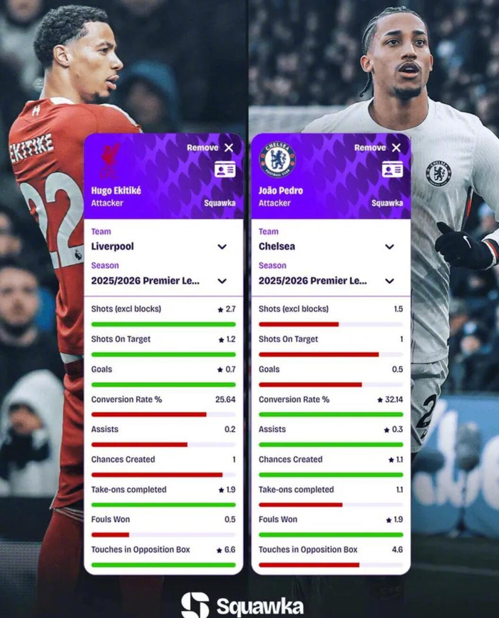 Squawka对比了埃基蒂克、若昂-佩德罗本赛季在英超联赛的场均(每90分钟)数据: