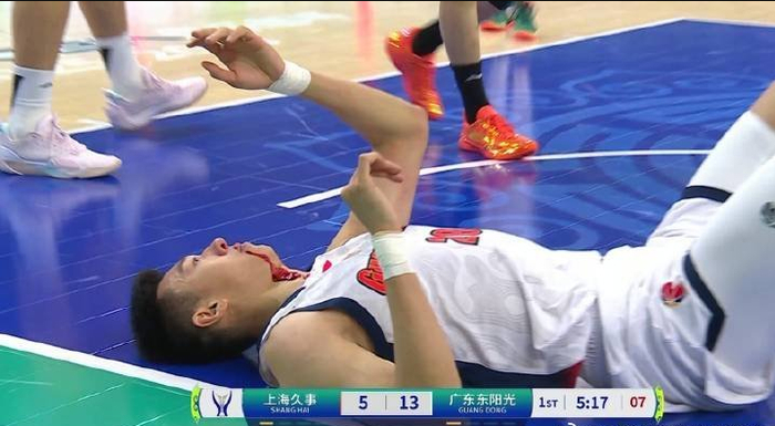 王少杰被打中面部,鼻子流血下场治疗。