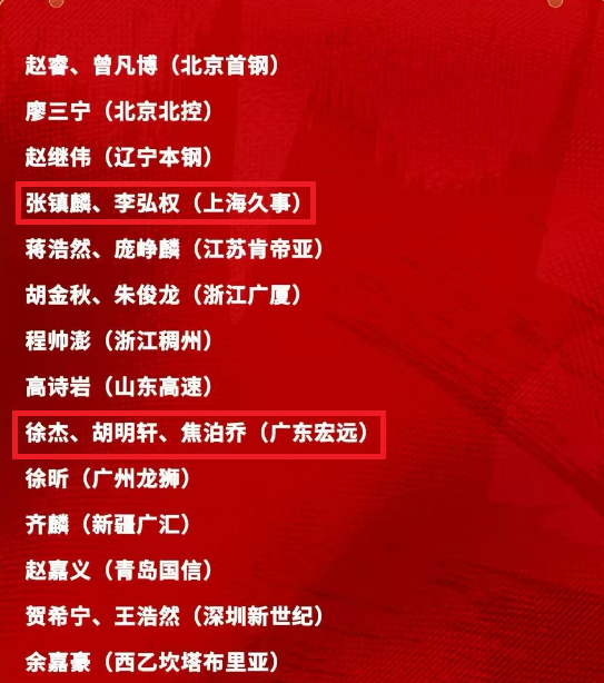 上海球员张镇麟与李弘权,广东球员胡明轩、徐杰与焦泊乔,他们入选中国男篮集训队缺席,老将刘铮也因为备战世预赛缺席。