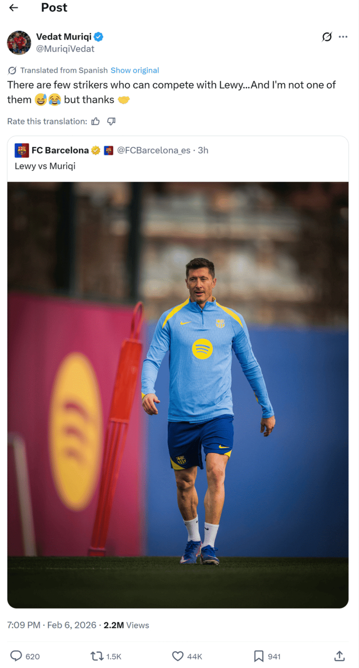 这番互动并未止步于俱乐部层面。穆里奇本人也用个人X账号转发并回应道:“能和莱万匹敌的前锋寥寥无几……而我不是其中之一。”他还配上了笑哭表情,并说道“但还是谢谢”。