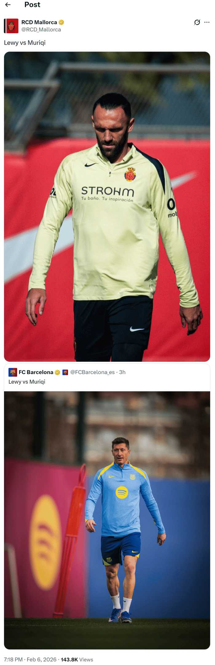 巴萨官方账号率先发布了一张莱万多夫斯基训练中的照片,并配文“莱万vs穆里奇”。随后,马略卡方面转发了该动态,并发布了一张风格相近的穆里奇照片,呼应了巴萨的表述。