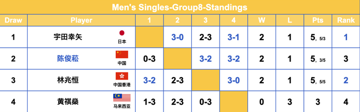 陈俊菘所在的组有宇田幸矢、林兆恒、黄祺燊,陈俊菘0-3不敌宇田幸矢是最惨烈的,直接拱手让出了晋级的先机,最终陈俊菘2胜1负,小分3/5排在小组第三无缘晋级。