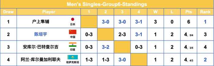 陈垣宇所在的组有户上隼辅、阿兰、安库尔,结果在这个组陈垣宇居然输掉了两场比赛,他分别0-3户上、2-3安库尔,最终因为小分5/4排在小组第三出局。