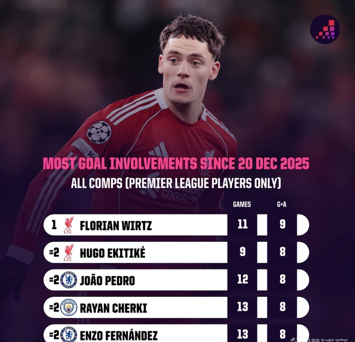 萨拉赫参加非洲杯,伊萨克因伤缺阵,维尔茨在这一段时间就是利物浦当之无愧的战术核心,埃基蒂克的球路与之非常契合,两位球员之间的化学反应推动着红军的前行。