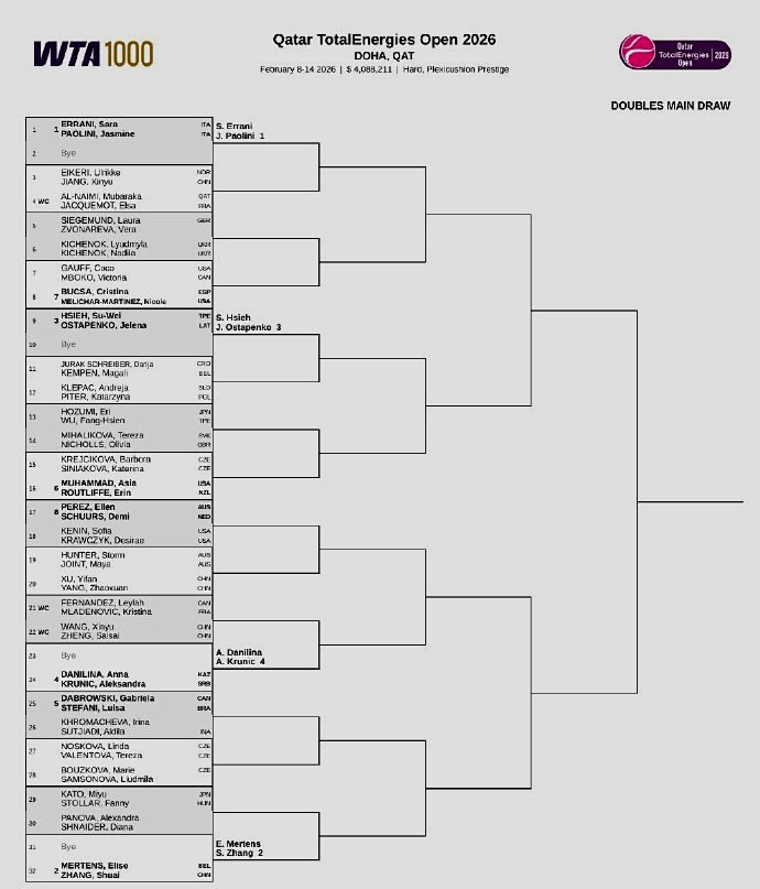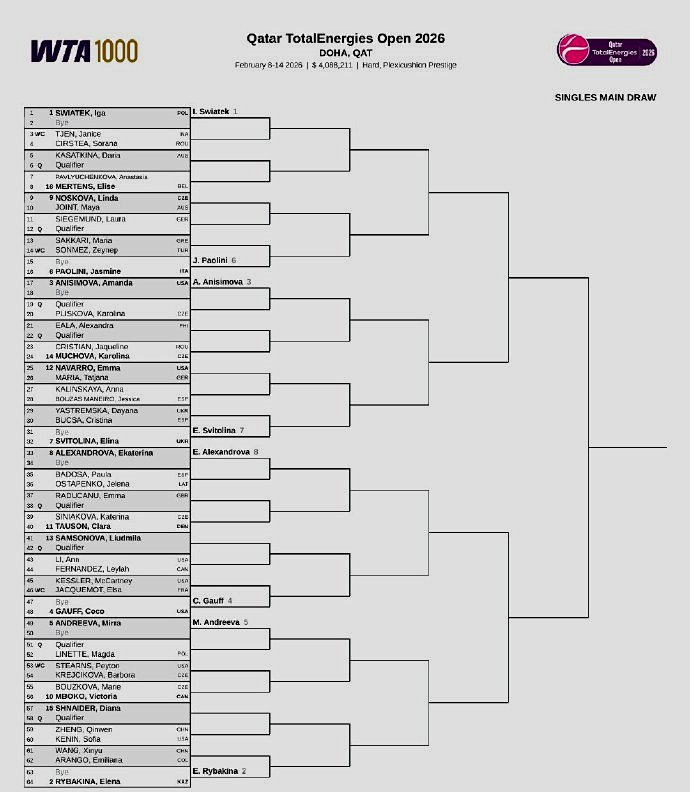 我们再来关注WTA1000多哈站。北京时间昨晚,这站女子1000赛公布了单双打正赛签表。单打前八大种子对位:上半区,斯瓦泰克--鲍里妮、阿尼西莫娃--斯维托丽娜;下半区,亚历山德洛娃--高芙、米拉-安德列娃--莱巴金娜。中国一姐郑钦文抽到了下半区,首战前澳网冠军肯宁。