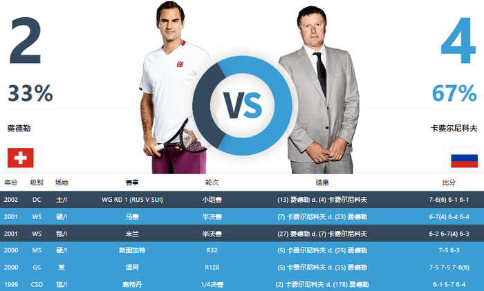 费德勒是网球场上的艺术家,娱乐了一代网球迷。尽管卡费尔尼科夫不认为他是史上最伟大,但他仍然尊重费德勒。毕竟,他亲眼见证了他的才华。以下是双方的交手记录。