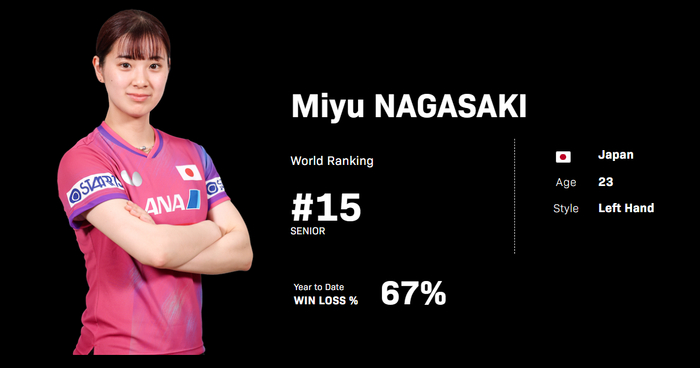 长崎美柚的世界排名仅仅第15,但在本届亚洲杯上她成为了一匹大黑马,她在循环赛上不仅仅拿到了一波三连胜,她还3-1爆冷击败了世界排名第六的国乒选手王艺迪。