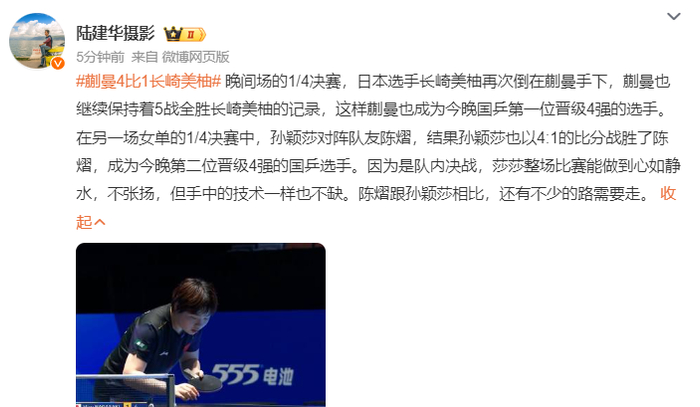 北京时间2月7日,亚洲杯女单1/4决赛,蒯曼4-1击败长崎美柚晋级四强,五局比分:11-6,11-6,6-11,11-5,11-4。此役后孙颖莎4-1击败陈熠,上半区的半决赛对阵出炉:孙颖莎VS蒯曼。