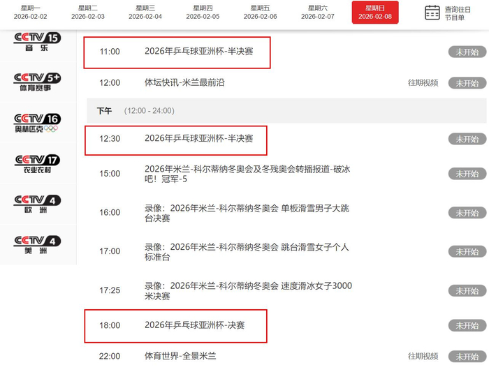 根据赛程,半决赛和决赛都在本周日进行,半决赛将在2月8日上午11点开始,等到下午18点进行决赛,央视CCTV5频道全程现场直播,目前节目单已经公布出来,半决赛的具体对阵形势如下: