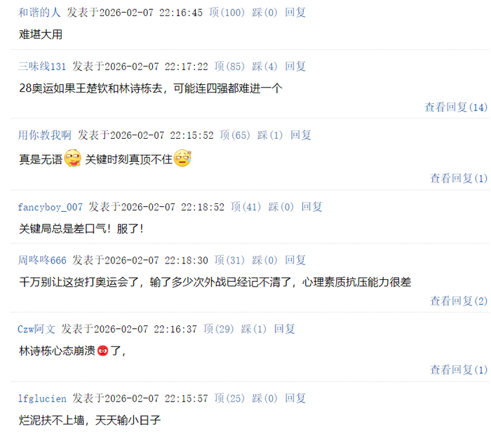 王楚钦晋级四强之后,林诗栋却掉链子出局,尤其总比分3-1领先情况下连输三局遭到逆转,真是不应该。