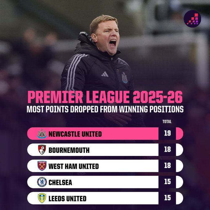 在本轮英超失利后,纽卡斯尔再次暴露出比赛掌控力不足的问题。数据显示,球队本赛季已经在领先情况下累计丢掉19个积分,这一数字为全英超最高。
