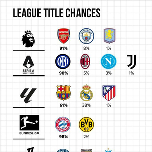 根据EuroClubIndex的预测数据,五大联赛最新夺冠概率如下。
