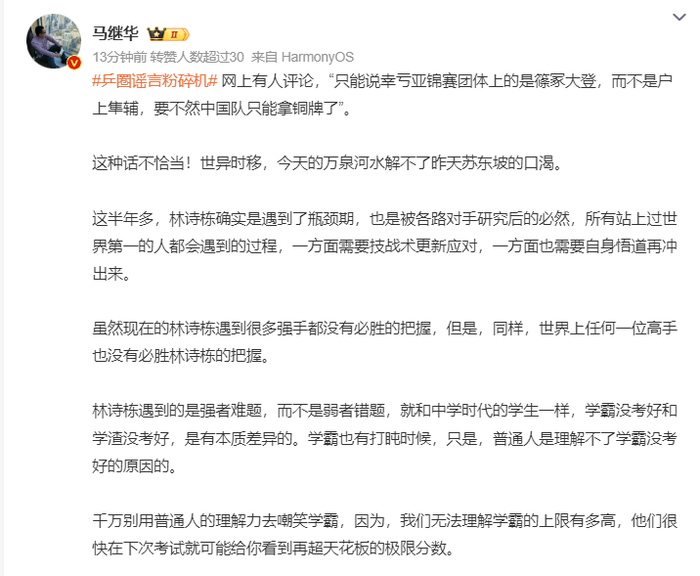 马继华老师赛后这样评价:林诗栋确实遇上瓶颈,也被各路对手研究透彻,他是曾经站在世界第一的球员,他需要更新技战术+自身突破。虽然现在的林诗栋遇到很多强手都没有必胜的把握,但是,同样,世界上任何一位高手也没有必胜林诗栋的把握。