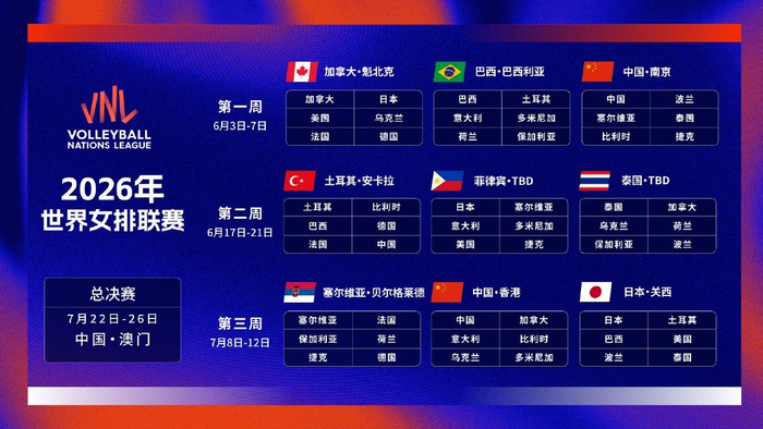 2026年世界女排联赛分站赛将于06月03日至07月12日进行,总决赛将于07月22日至07月26日在中国澳门举行。参赛的18支队伍为比利时、巴西、保加利亚、加拿大、中国、捷克、多米尼加、法国、德国、意大利、日本、荷兰、波兰、塞尔维亚、泰国、土耳其、乌克兰、美国。06月03日至06月07日进行2026年世界女排联赛首周比赛的争夺,中国女排将在南京青奥体育公园体育馆先后迎战捷克、泰国、塞尔维亚、波兰。 第二周比赛将于06月17日至06月21日进行,中国女排将在土耳其安卡拉先后迎战德国、法国、巴西、土耳其。第三周比赛将于07月8日至07月12日举行,中国女排将在中国香港先后对阵加拿大、乌克兰、多米尼加、意大利。分站赛中国女排具体赛程如下(北京时间):