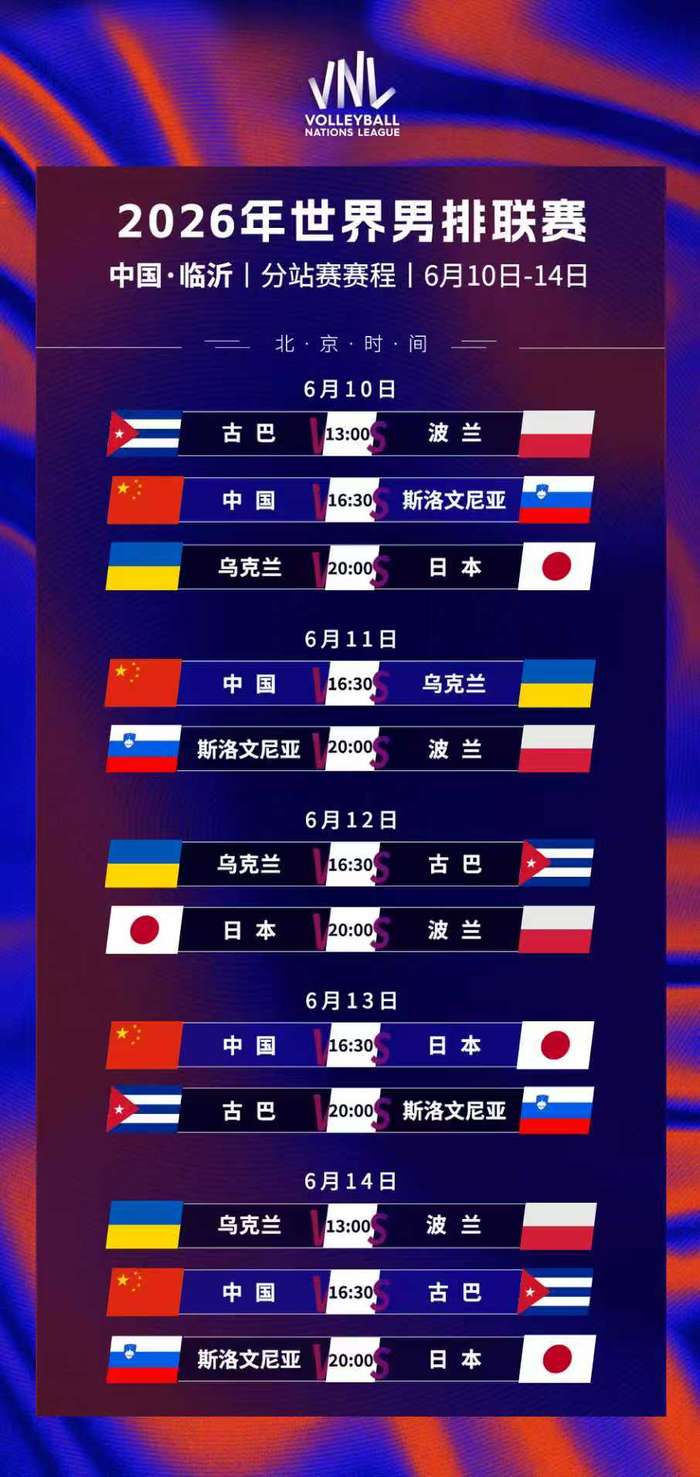 06月10日至06月14日开启2026年世界男排联赛首周比赛,中国男排将在临沂奥体公园体育馆先后迎战斯洛文尼亚、乌克兰、日本、古巴。第二周比赛将于06月24日至06月28日进行,中国男排将赴波兰格利维采参赛,先后对阵土耳其、比利时、阿根廷、德国。第三周比赛将于07月15日至07月19日举行,中国男排将前往美国芝加哥参赛,先后对阵美国、法国、保加利亚、巴西。