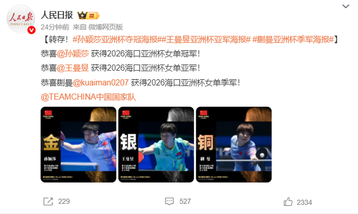 《人民日报》恭喜了国乒三位女生,冠军孙颖莎、亚军王曼昱、季军蒯曼。女队的统治力的确超过了男队,因为男队只有一人可以站在领奖台,四强里面只有王楚钦一人。