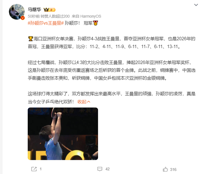 赛后马继华评价这场比赛,这是孙颖莎去年年底遭遇伤病后重返赛场之后斩获的首个金牌。这场比赛太精彩了,双方都发挥出最高水平,王曼昱顽强、孙颖莎凌厉,真是当今女子乒乓绝代双骄。