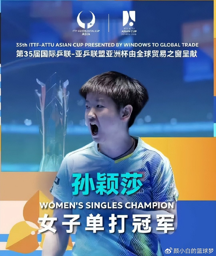 这个夜晚对于孙颖莎来说是双首冠之夜,这是她生涯亚洲杯首冠,去年她在决赛中不敌王曼昱只是亚军,其次这也是孙颖莎2026赛季的首冠,因为去年年底WTT香港总决赛女单半决赛左脚踝扭伤后她就进入养伤,其后的乒超总决赛、WTT多哈冠军赛、WTT多哈球星挑战赛都没参与。