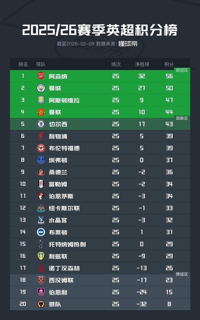 北京时间2月9日,2025/26赛季英超联赛结束了第25轮的全部比赛,积分榜的形势也产生了进一步的变化。
