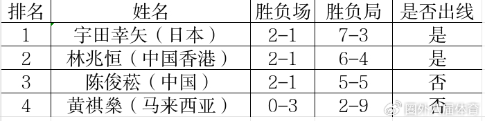 宇田幸矢和林兆恒位列小组前二,晋级16强;陈俊菘因为胜负局的差距,位列小组第三,无缘出线。