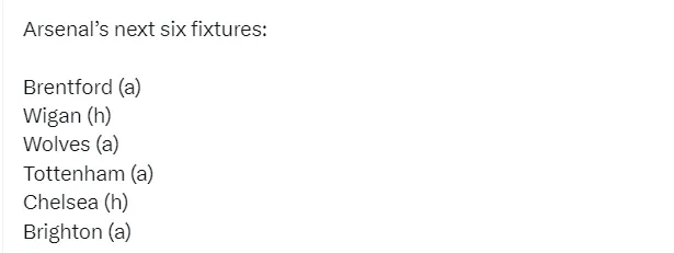 阿森纳未来6场比赛:客战布伦特福德、主战维冈、客战狼队、客战热刺、主战切尔西、客战布莱顿。