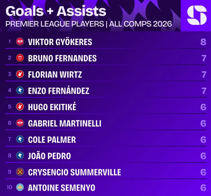 自2026年以来,哲凯赖什已经在各项赛事贡献6球2助攻,是同期所有英超球员中各项赛事参与进球数最多的(曼城和利物浦比赛开打前)。
