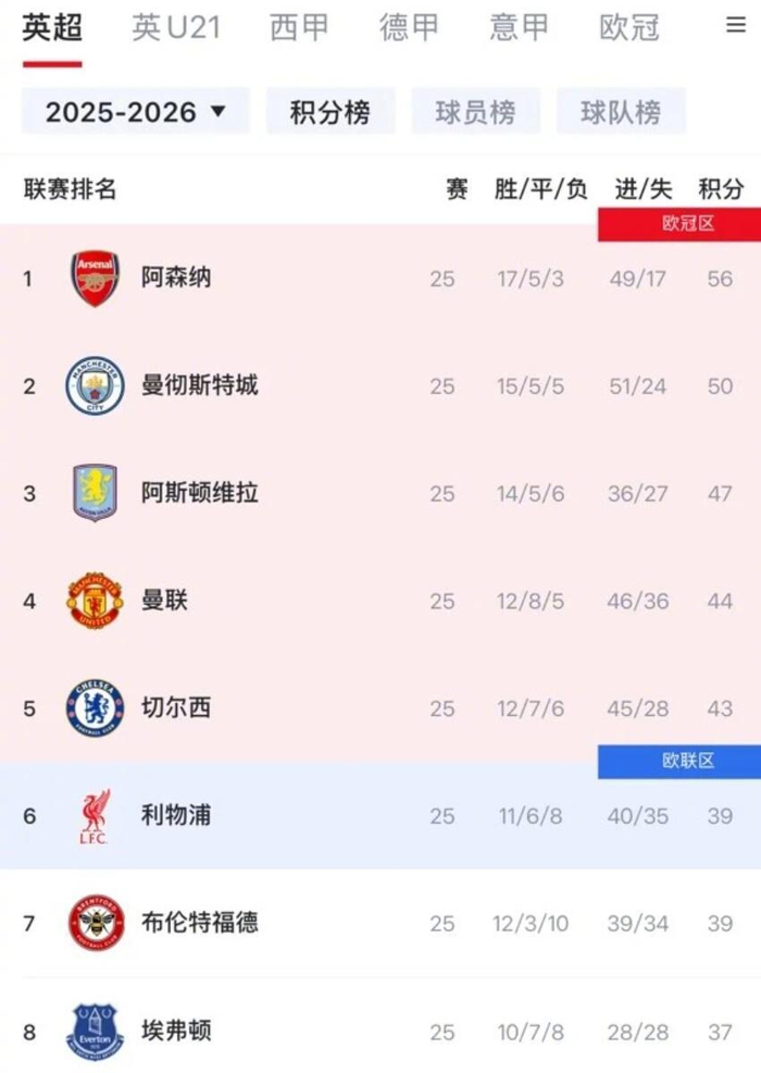 利物浦落后蓝军4分,暂时位于欧联区内,凭借净胜球优势领先布伦特福德。